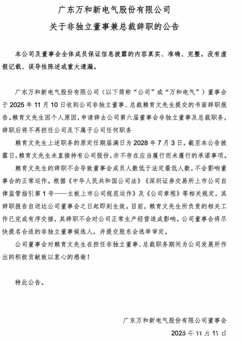11月11日,家电企业万和电气发布的一则人事公告引发关注:公司非独立董事、总裁赖育文因个人原因申请辞职,辞去包括董事会职务在内的公司及下属子公司所有任职宏图优配,其原定任期本应至2028年7月3日。这一决定距其9月以96.08%的高票当选非独立董事仅过一个多月,让这场被视为企业治理结构优化的重要变革蒙上神秘面纱。