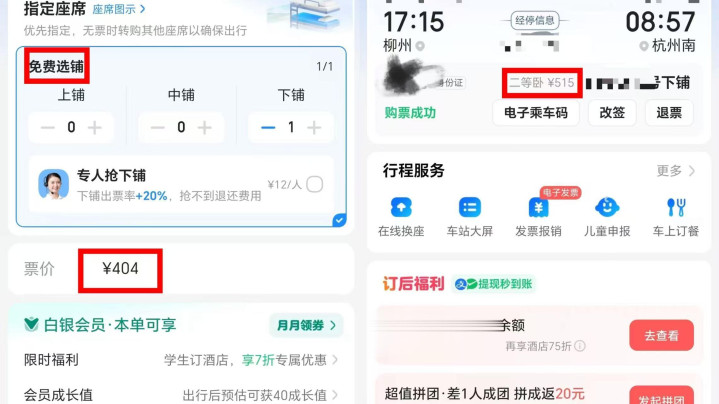 不久前,广西消费者王冉(化名)在投诉平台就第三方购票平台的问题进行了投诉。今年11月,她在小程序上购买了一张从柳州至杭州南的动车二等卧铺车票。在她给记者展示的截图中,二等卧铺票价显示为404元,且标注了“免费选铺”,支付时价格却变成了515元。