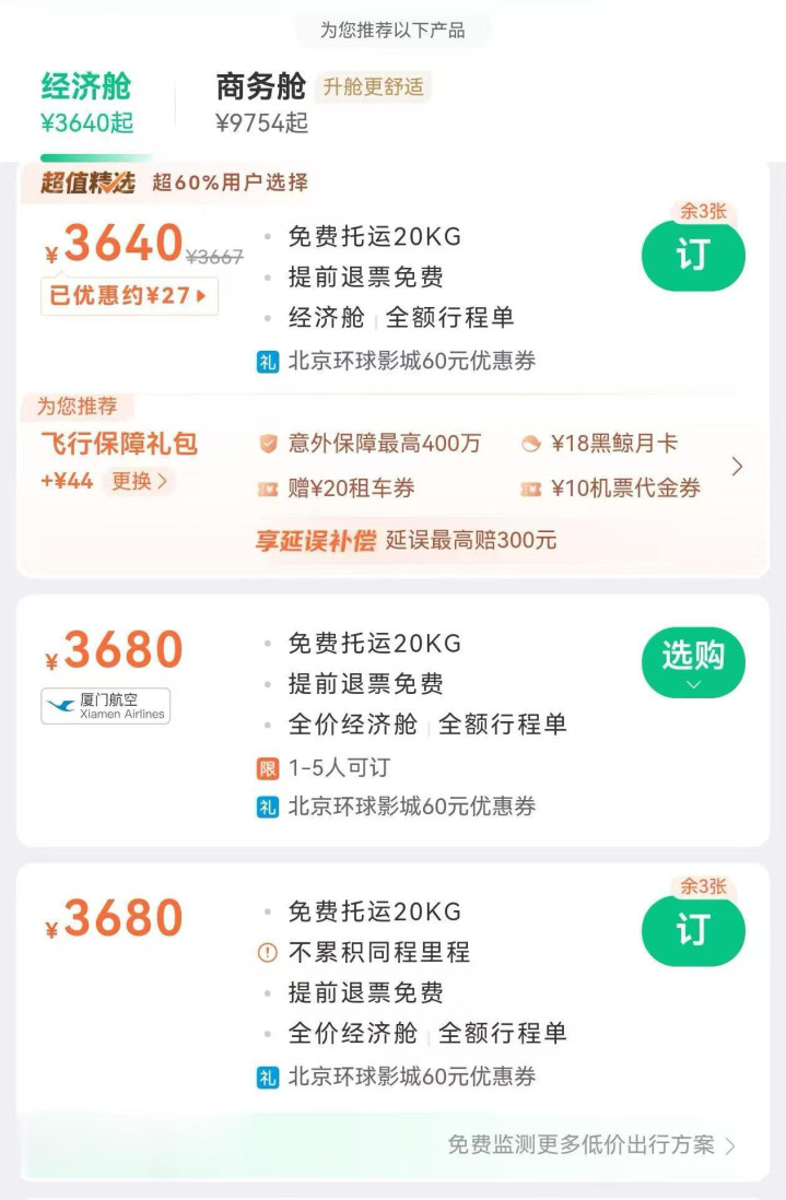 例如记者在另一购票平台查询了一趟从三亚到北京的机票,排名第一的选项价格为3640元,“订票”按钮的设置与价格平行,在一条分隔线下方写着“为您推荐飞行保障礼包”,看起来这是一个需要额外点击才会购买的独立选项,但实际上这也是一个捆绑销售的套餐产品。